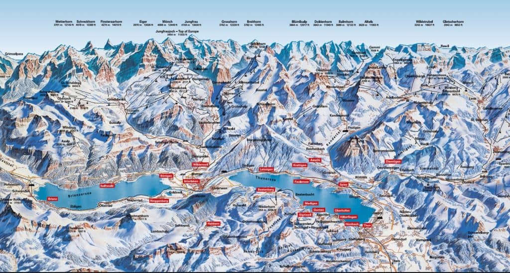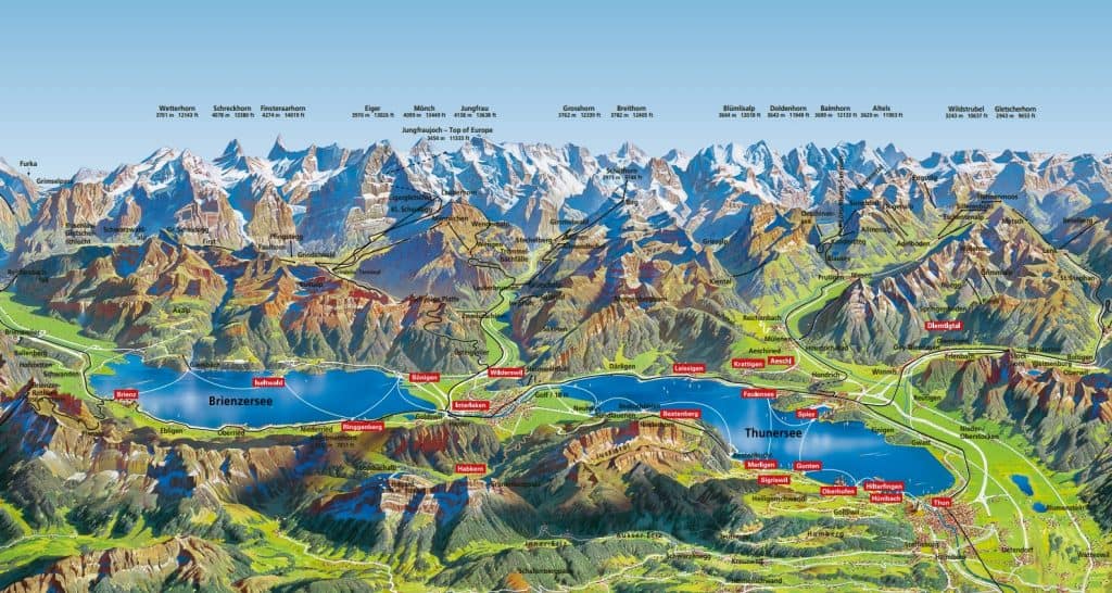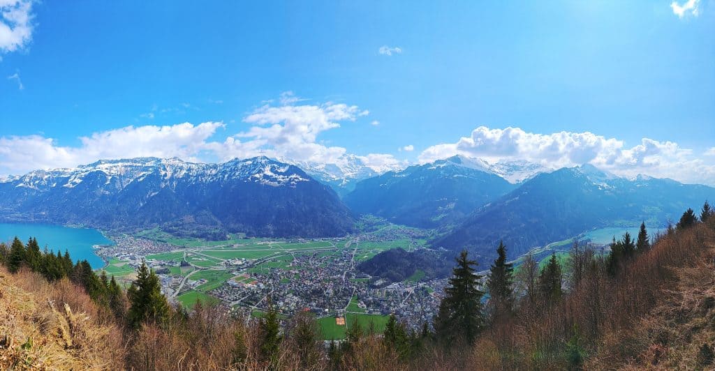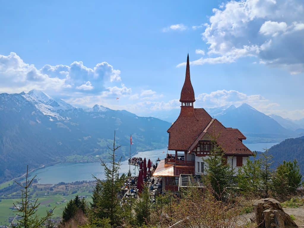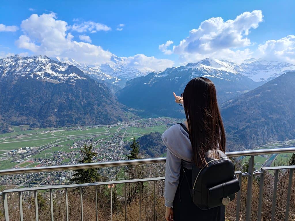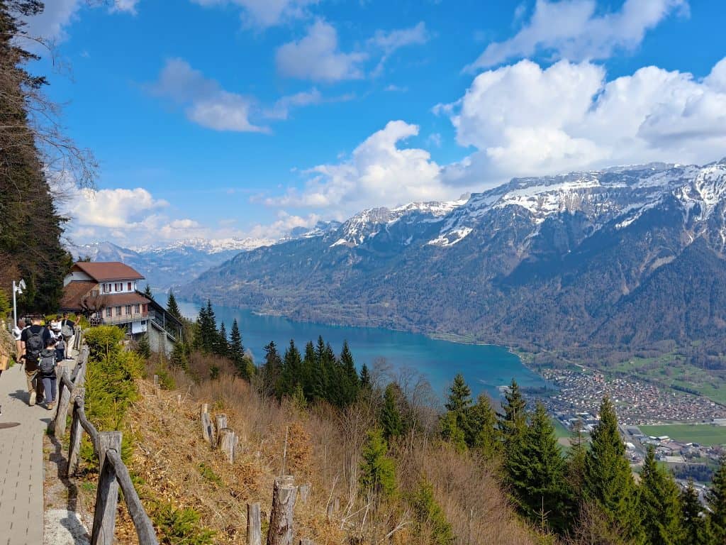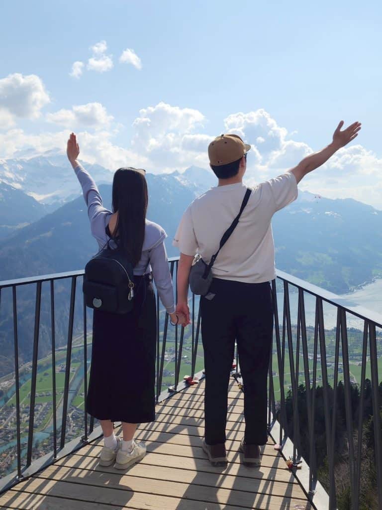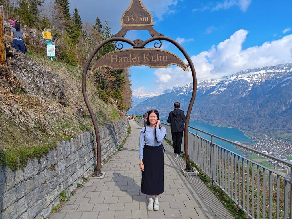 Harder Kulm 景觀台能將三峰二湖盡收眼底:艾格峰、僧侶峰和少女峰;圖恩湖、布里恩茨湖 (韓劇《愛的迫降》玄彬鋼琴演奏劇照視角)