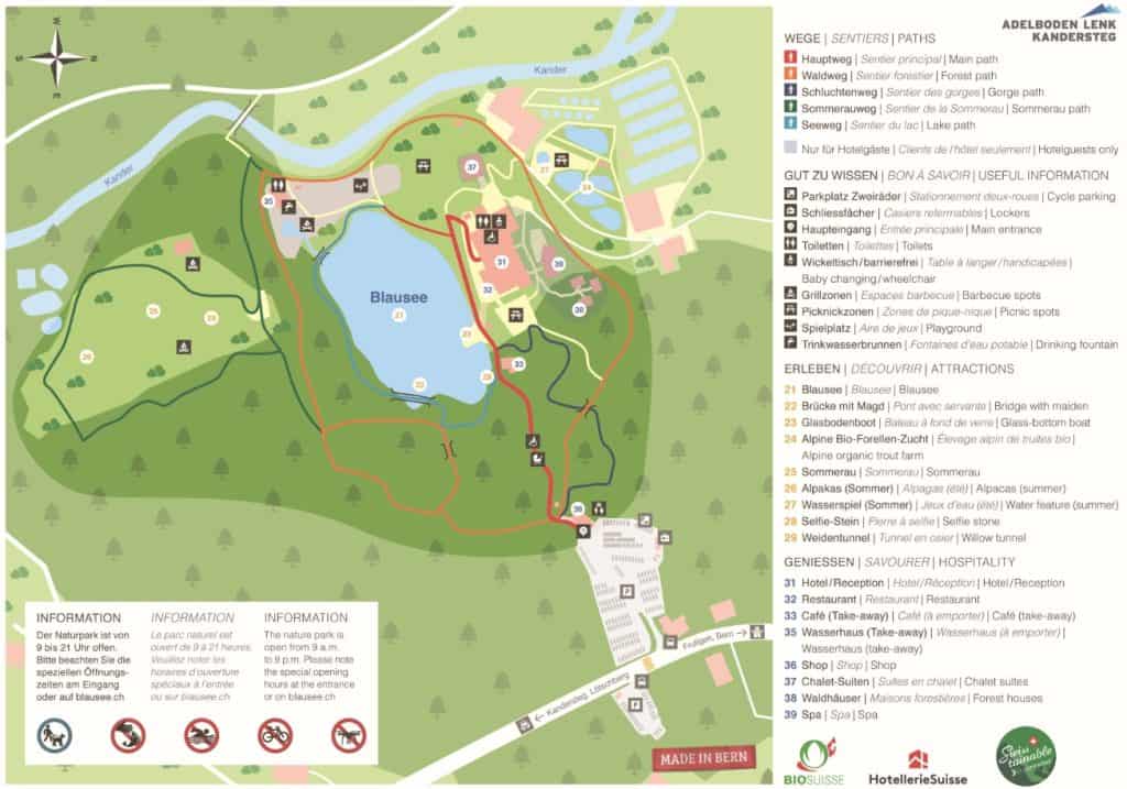 - 自然遊樂器材區:位在Wasserhaus 餐廳旁邊,可以野餐、燒烤 (現場備有柴火供使用)。在夏季時,在地的可愛羊駝和草泥馬會從艾希 (Aeschi) 搬到藍湖附近的 Sommerau 森林空地