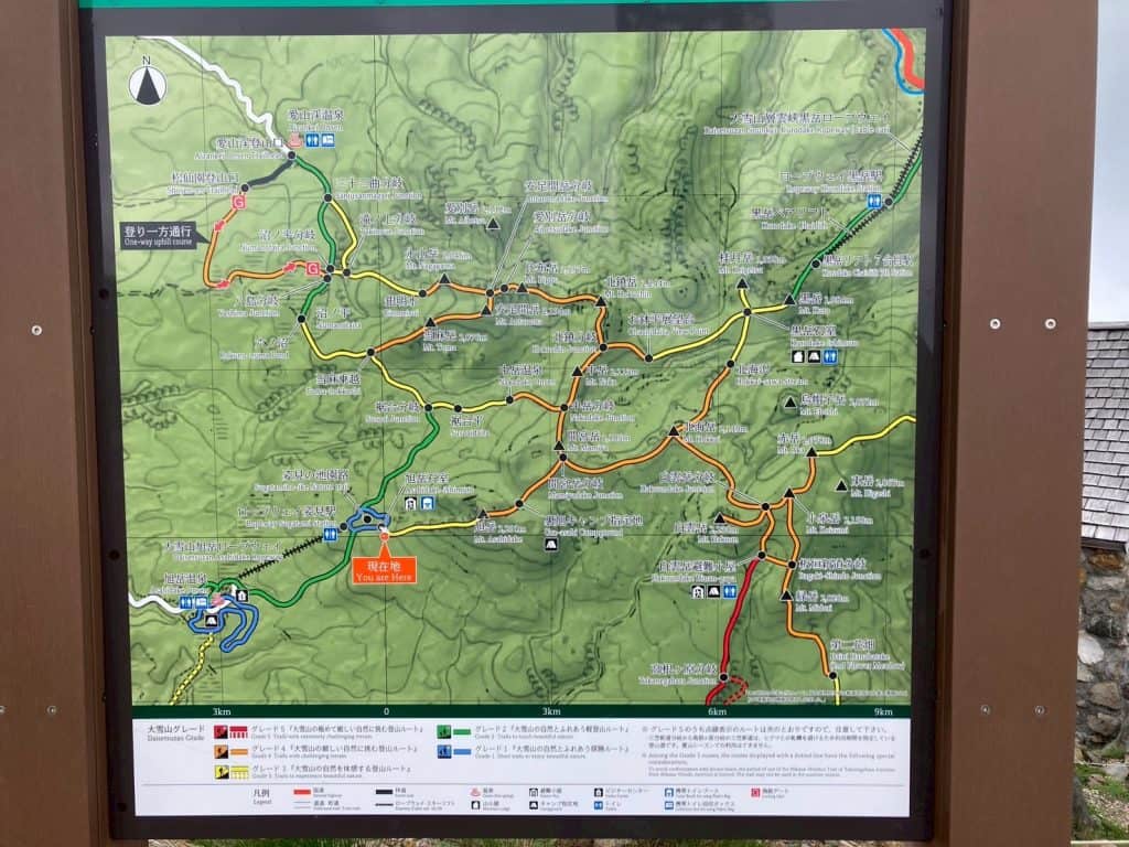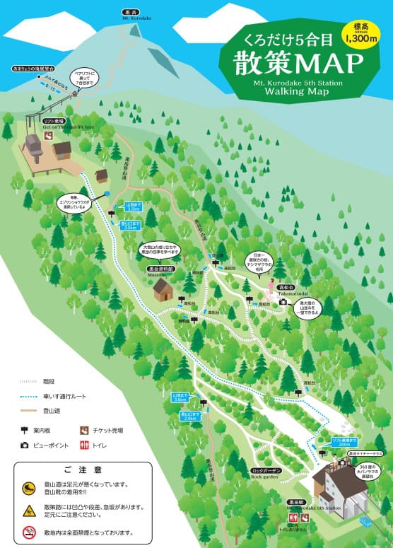 - 第一段 纜車 7分鐘:廂型式團體纜車,從海拔670公尺處層雲峽站前往標高1300公尺的「五合目黑岳站」,是黑岳車站內最後一個洗手間。