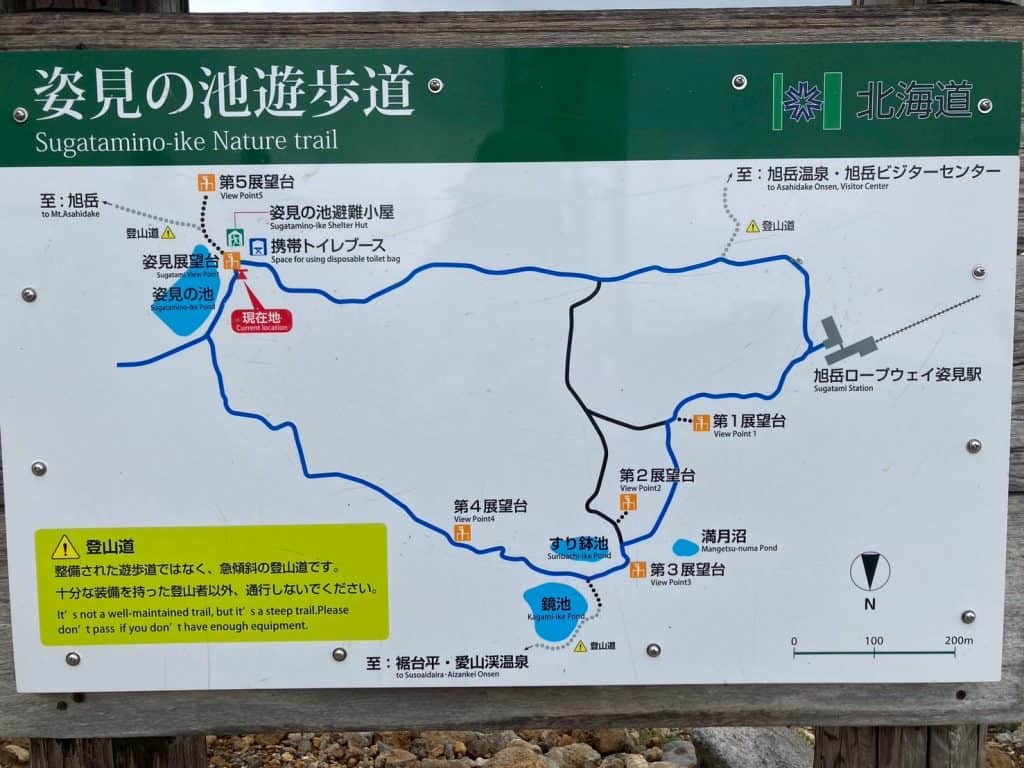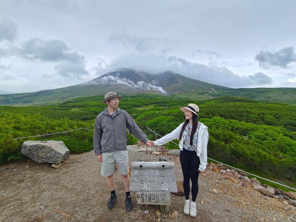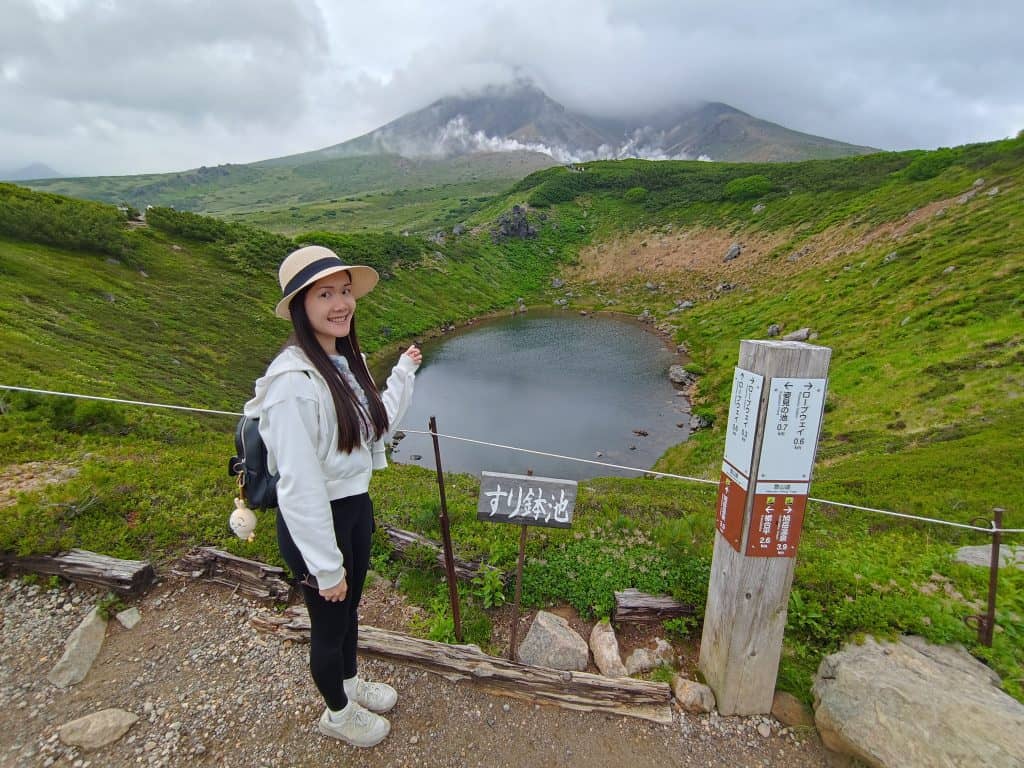 旭岳建議7-8月健行,6月中仍有殘雪,獨特地形沿途的風景令人嘆讚不絕,交錯各種大小湖泊 (姿見池、夫婦池)、火山噴氣孔,瞭望台,高山植物,池沼水面倒映着旭岳連峰,豐富的自然景點、便利的交通方式,完全大勝 紐西蘭東加里羅國家公園火山步道健行、日本青森奧入瀬溪流