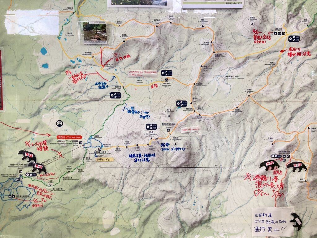 提醒出發前:請務必造訪棕熊情報中心,瞭解遇到熊隻時的應對方法。在旭岳姿見站的遊客中心,有近期「棕熊最新情報」、「登記名冊」,由於近年天熱、且發生多起野生棕熊攻擊人類事件,建議山友自行評估風險後再判斷前行…