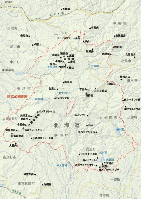 大雪山國立公園超過16 座 2,000 公尺以上高的山峰,被譽為「北海道屋脊」,由構成大雪破火山口的大雪火山群、以十勝岳為主峰的活火山十勝嶽山脈、然別湖周圍的然別火山群、以及由日高系古土壤構成的石駱嶽山脈組成