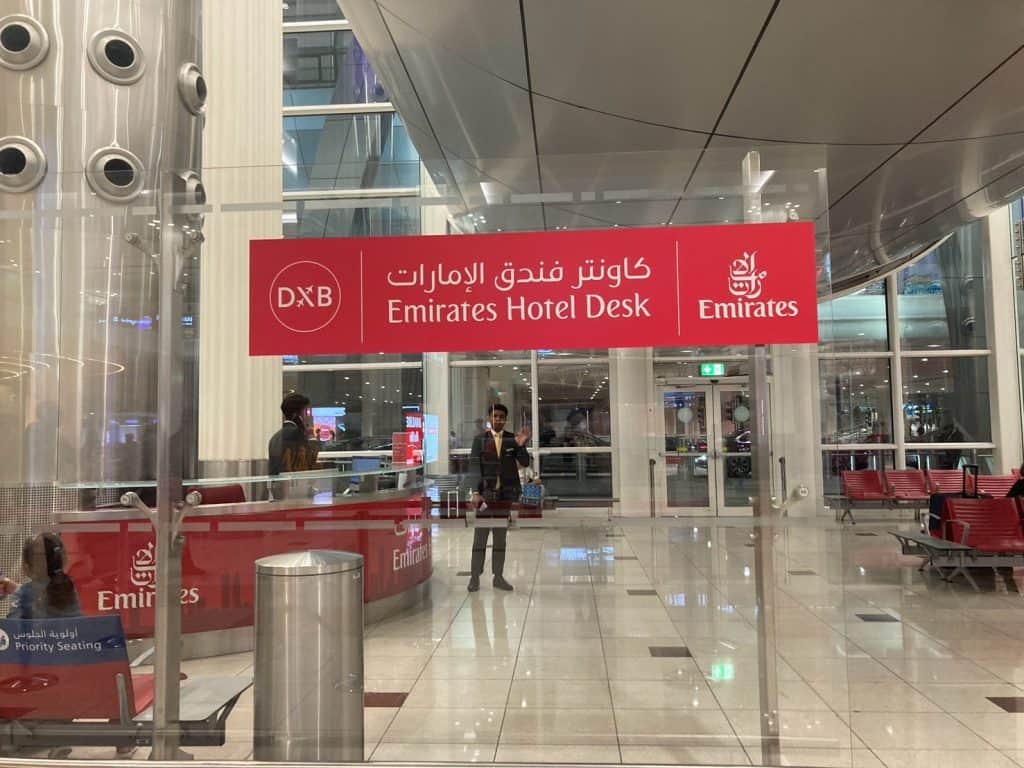 Emirates Airline Dubai Transit Hotel Emirates hotel desk red signs
