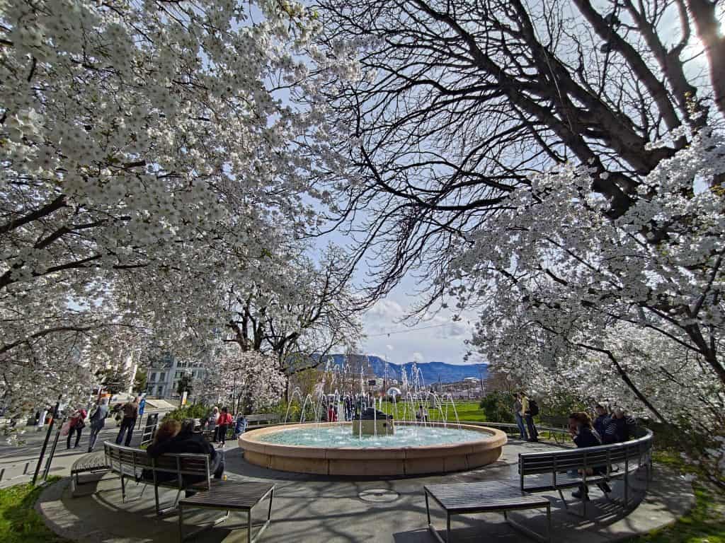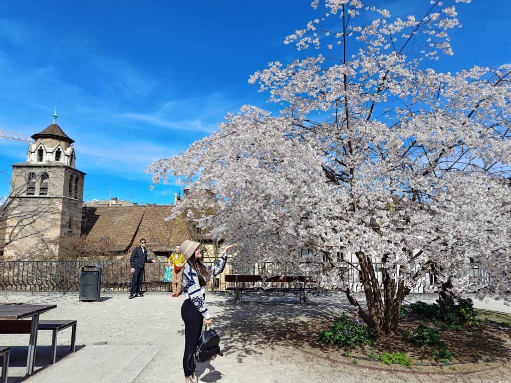 日內瓦三月下旬,除了櫻花第一次欣賞日內瓦玉蘭花,色澤比櫻花更粉,將春天渲染成粉紅色。另外,每戶人家庭院內種植不同顏色的植栽品種,令人賞心悅目