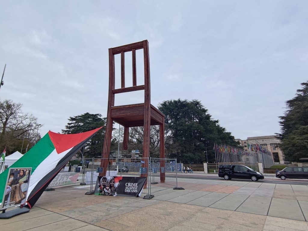斷腳椅 (Broken Chair) 立在萬國宮的正對面,過一個馬路就到,之所以做成斷一隻腳的椅子是為了紀念《渥太華禁雷公約Ottawa Treaty》的生效,是為提醒世人有尊嚴的活著,三腳椅向空中翹起的單腳,露出不規則寓意是被炸彈擊碎的不完整