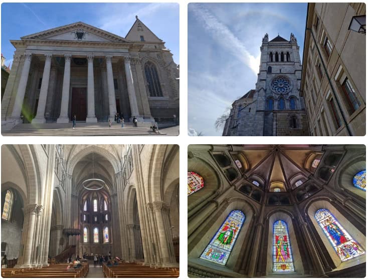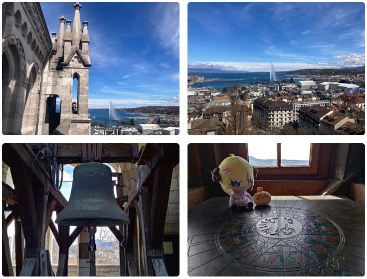 日內瓦聖彼得大教堂與宗教改革人物加爾文有關,鐘樓夾在中間的樓層,陳設風速儀;教堂登頂可眺望日內瓦湖景,日內瓦明信片當中的取材角度