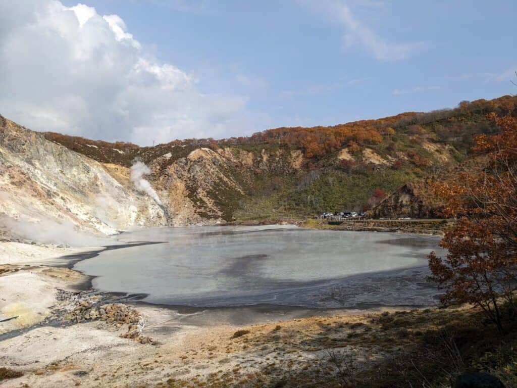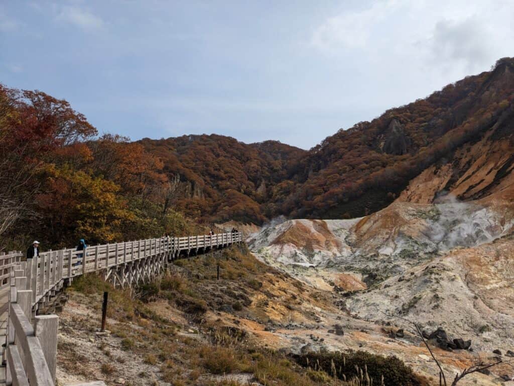 - 登別地獄谷的十月紅葉季 : 從地獄谷入口一路向上健行,會經過大湯沼欣賞美景,還可以走一小段路去河邊的天然足湯泡泡腳,來登別要記得帶條小毛巾