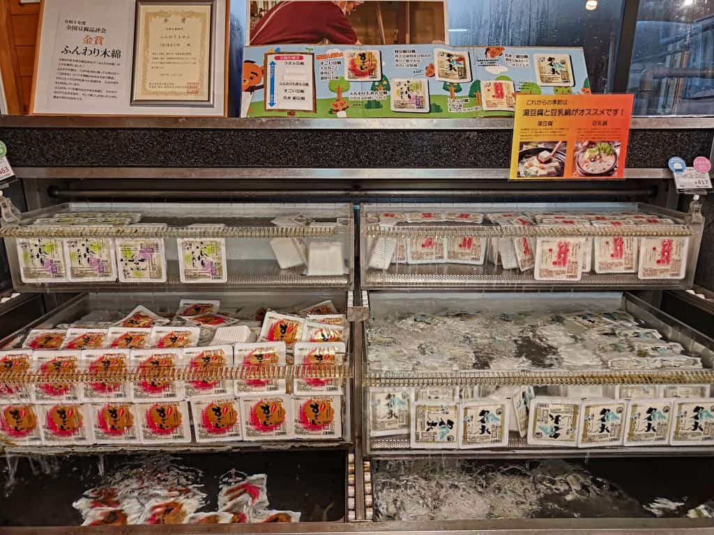 真狩豆腐工房 : 豆製相關的炸豆皮、飲用豆乳、豆腐蛋糕、豆腐麻糬、納豆豆腐、炸物,我們購買第一名豆腐(硬度列居亞軍)、豆乳、蕎麥麵