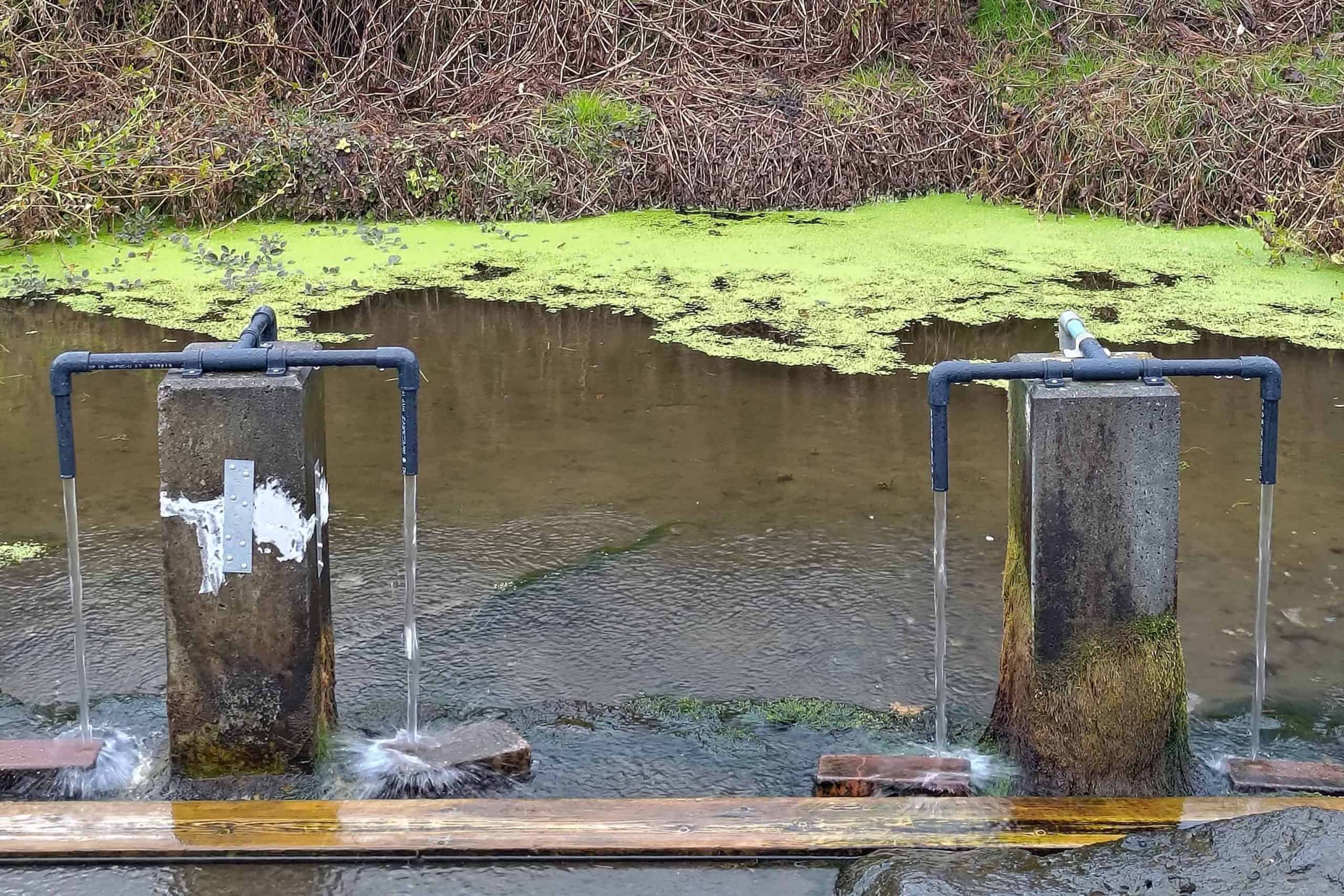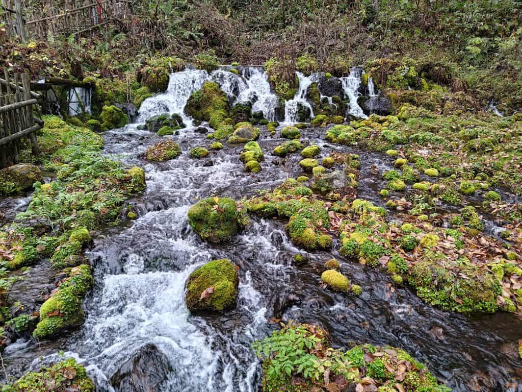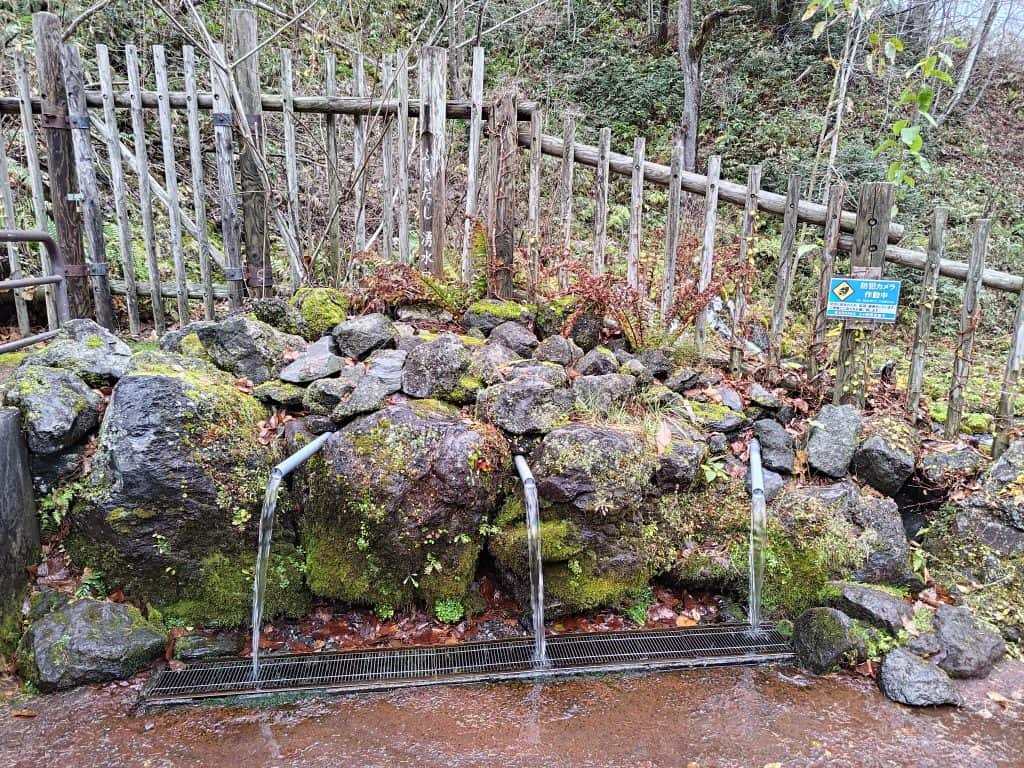 - 停車場走過一座鐵橋,再往下走到小公園,有個較大的湧泉點,能盛裝免費山泉水