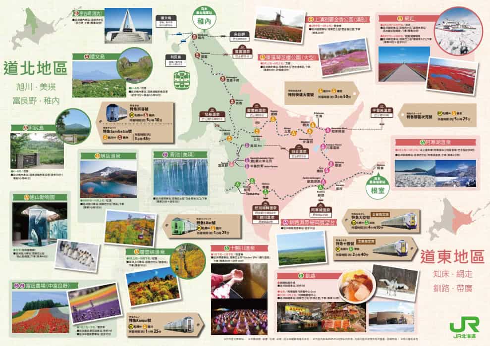 - 旭川、層雲峽、天人峽地區:旭山動物園、黑岳、旭岳、當麻鐘乳洞等