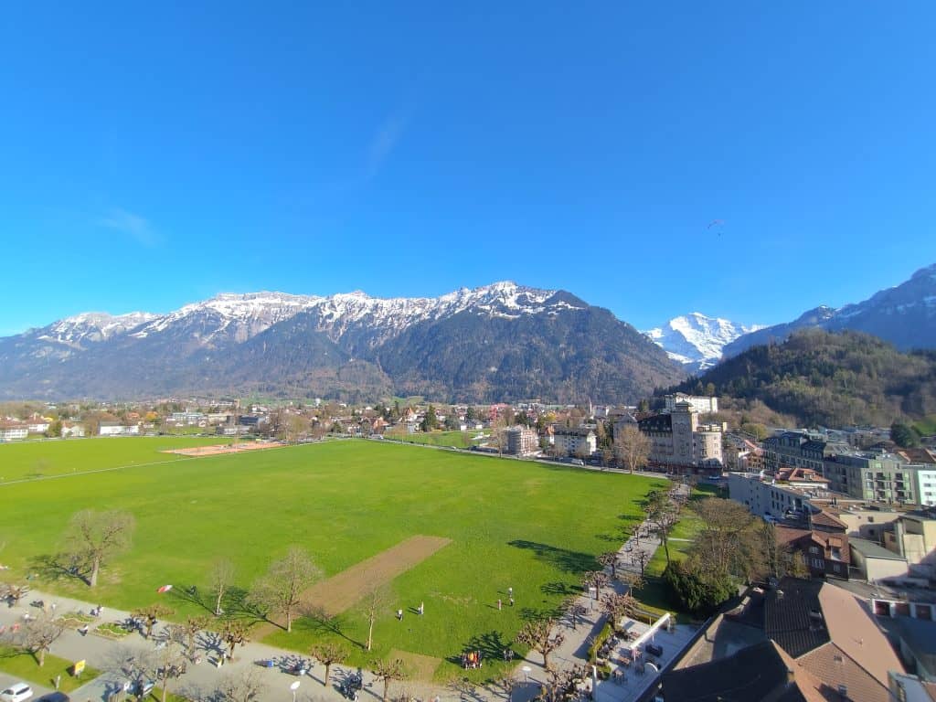 因為飛行傘落地草原就在馬路對面-茵特拉根高地公園,房內小陽台甚至可以欣賞飛行傘活動,拍張藍天白雲下的少女峰+飛行傘