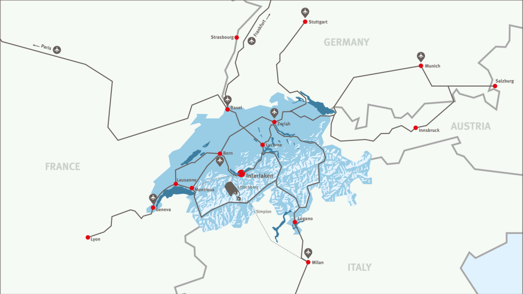 茵特拉根 (Interlaken) 位於瑞土中部,源自拉丁語 (Inter Lacus),意指「在湖水之間」,位在布里恩茲湖 (Lake Brienz)、圖恩湖 (Lake Thun) 間。被艾格峰 (Eiger)、僧侶峰 (Mönch) 和少女峰 (Jungfrau) 這三座名山環繞,更是前往少女峰的交通要道。茵特拉根留宿3晚的行程:
