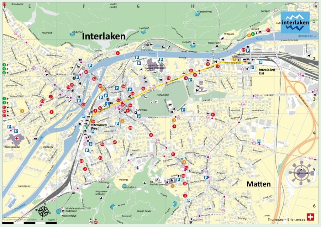 茵特拉根西站 (Interlaken West) → 茵特拉根高地公園 (Höhematte Park) → 維多利亞酒店 (Victoria-Jungfrau Grand Hotel & Spa) → Kursaal花園 (Kursaal-Park)→ 日本友好的庭 → 茵特拉根東站 (Interlaken Ost)