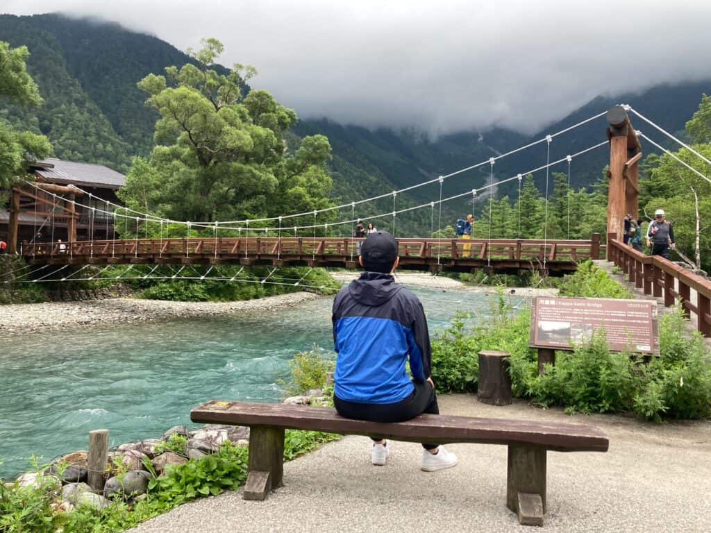本次上高地散策路線從河童橋出發,往明神池方向走,一路地勢平坦,行走難度不高,對小朋友來說也很適合,甚至有推著輪椅長輩出遊的家庭。走到明神池再走回河童橋整趟約兩個小時,盛夏七月的上高地天氣也十分宜人,比平地市區低了10-15度,在林間步道可能遇到野生動物,我們就和悠閒散步的獼猴擦身而過。 因為是受保護的自然環境,在此區也可能遇到熊,飯店都會告知熊的目擊情報,也可攜帶飯店的熊鈴,避免在野外落單
