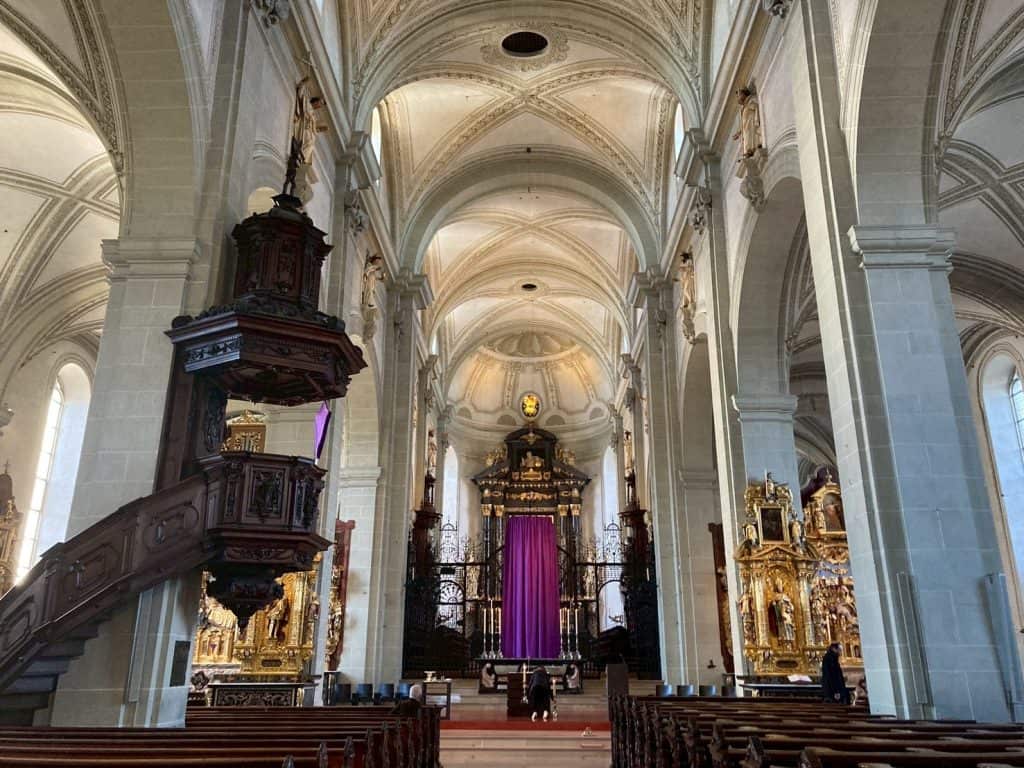 聖萊奧德伽爾教堂原本是羅馬式建築風格,因一場大火而重建於1633年至1639年修建,現為雙塔哥德式外形、內裝新穎且簡單,信徒禮拜常見是一整排的椅子,但獨立式高級椅子、相當少見,也是瑞士後期文藝復興時期最大、美術史豐富的教堂