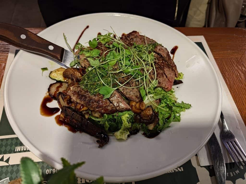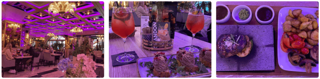 網路高評價的美食餐廳,內部裝潢新穎,點了開胃菜雞肝麵包塔、spritz無酒精調酒*2、泰式雞肉墨魚義大利麵、石板牛排套餐,含服務費336波幣 (台幣約2,790元);服務感受良好,特別多給一段點小費感謝她,但上菜速度稍微慢,推薦來放鬆享用美食的人