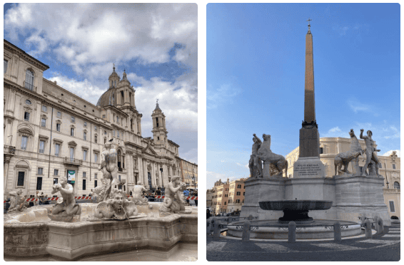 納沃納廣場 (Piazza Navona) 於1651年,由建築師濟安·貝尼尼設計,建有著名的中央四座大河噴泉豎立於此,支撐的古羅馬方尖碑,大河分別代表當時四大洲的非洲尼羅河,亞洲恆河,歐洲多瑙河、美洲拉普拉塔河,廣場上擠滿人潮