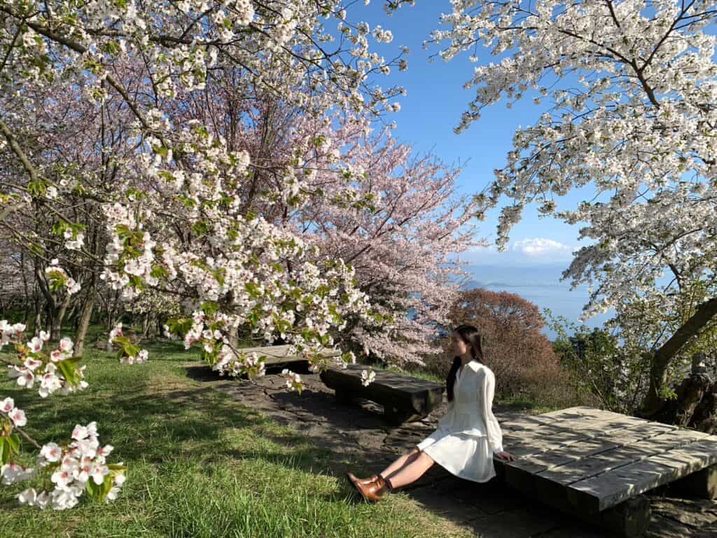 向上步行到園區山頂至高點,約10分鐘,紫雲出山的陽光日,有櫻花、雲海、海岸線,極美
