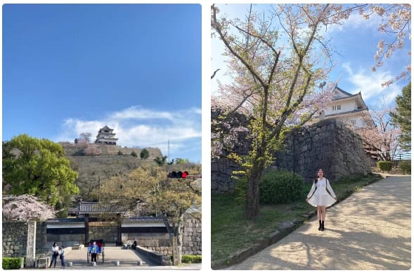 丸龜城 (Marugame-jō):日本第一高的石造城門口處,從停車場入口一路陡上, 小小城、戶外比室內美。丸龜城遊客中心有當地老奶奶在編織在地物產