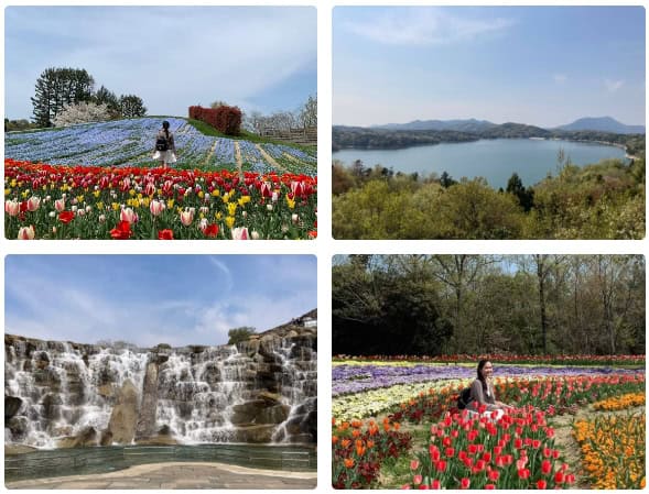 滿濃池公園:是四國唯一的國營公園,四月到訪能欣賞鬱金香花海,公園內有人工瀑布,許多家庭會來此野餐、小孩會玩球、溜滑梯、跳跳床,甚至有攀岩、騎腳踏車、作為遠足闔家歡樂的公園,能遠眺穠滿池與金刀比羅宮