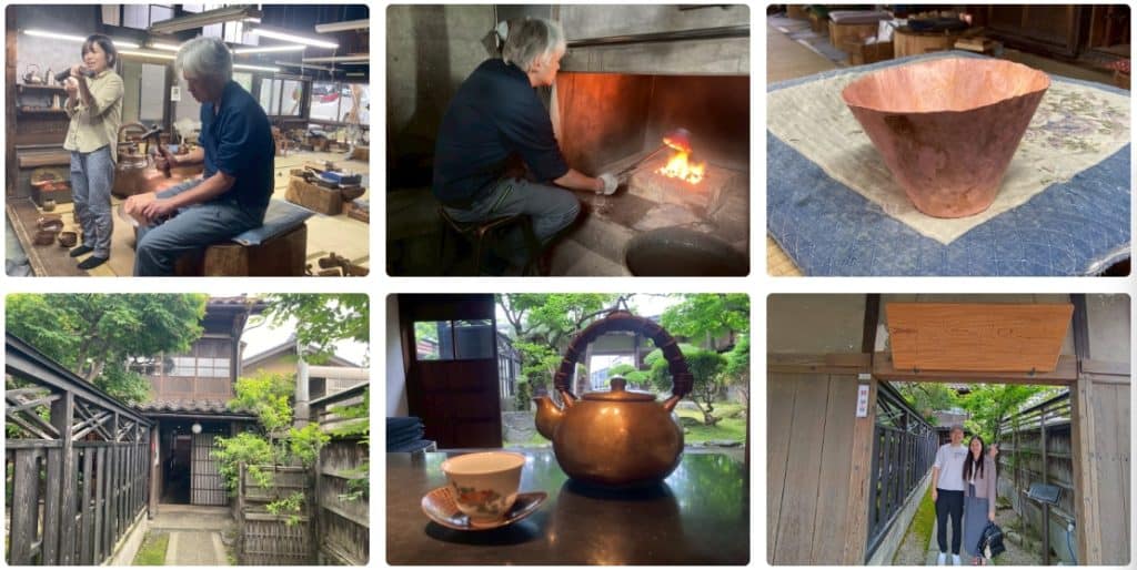 玉川堂 (Gyokusendo):擁有200年底上歷史,見識到「鎚起銅器」,以個人參訪、人數在五人以下皆不需預約 見學工廠皆附設停車場,對自駕相當方便。玉川堂建築仍保留著在大正時期的外觀風格,為了避免重複鎚製過程出現噪音會影響鄰居,室內裝置了挑高天花板、防噪窗戶