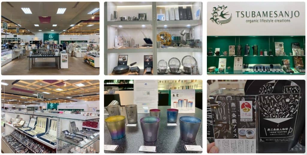 燕三条地場產中心物產館是綜合型商店,主要販賣居家工具、容器器皿…等等,最有特色是金屬加工(鐵、銅製)製品,舉凡杯子、餐具、咖啡濾杯、刀子,也有少許食品、伴手禮;現場不定時展出當地職人手藝表演製作刨刀、加工金屬的過程